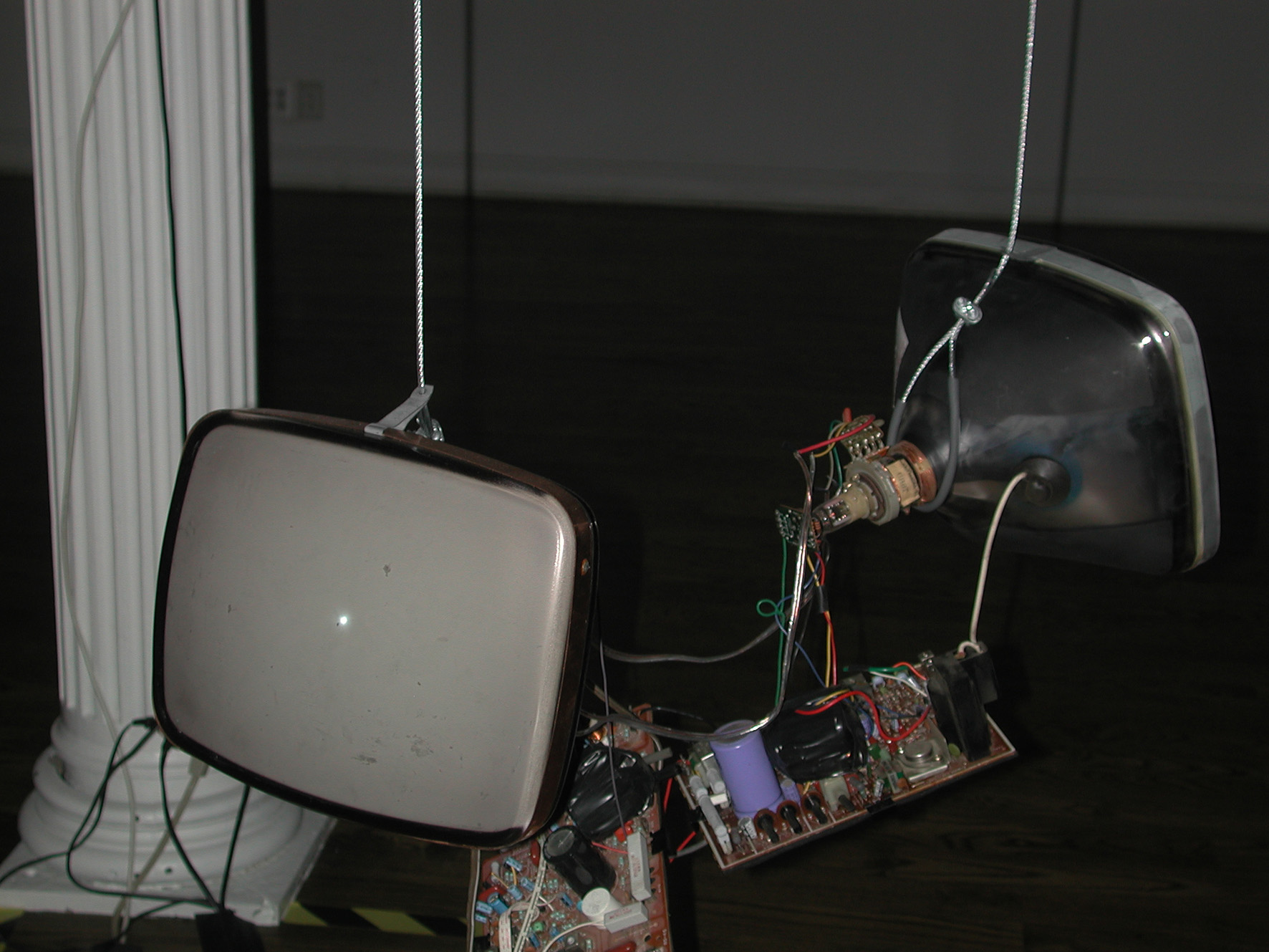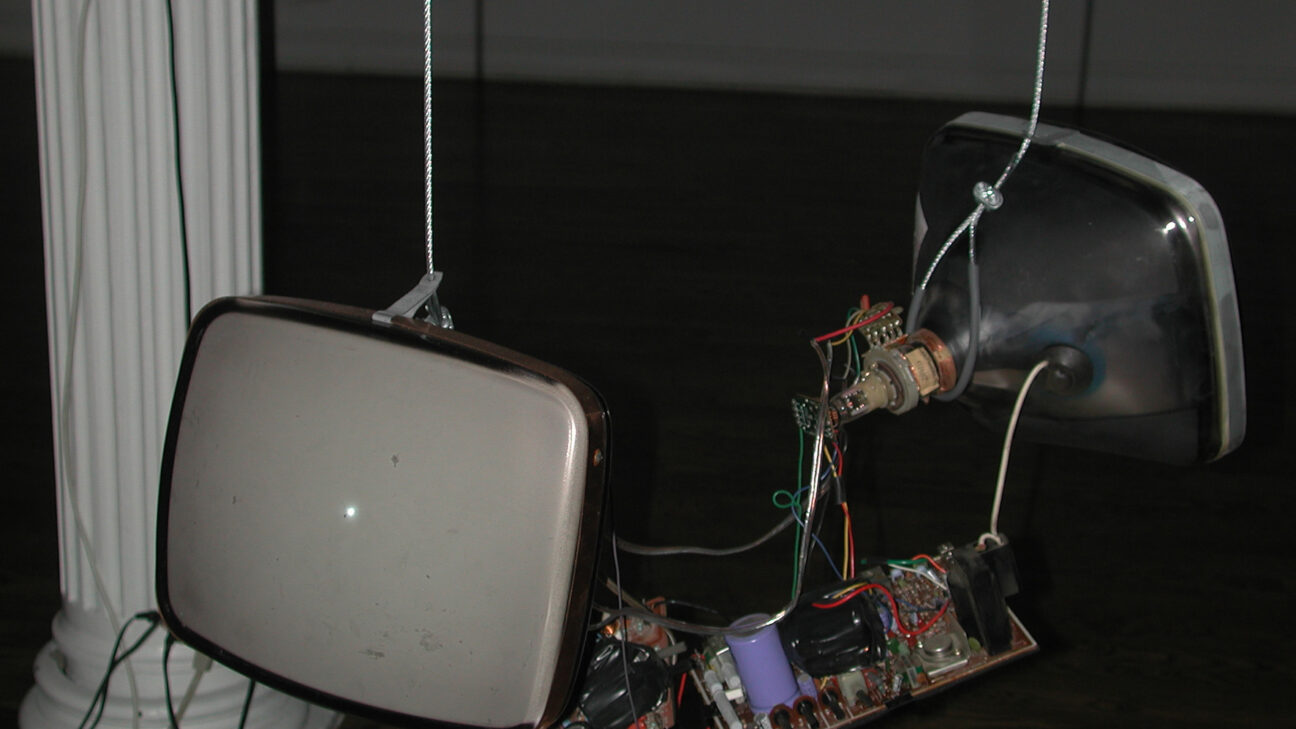 Heather Wagner has created sound installations and Internet performances that explore ethernity, the imaginary connection between cyberspace and dreams. Her piece acts like a transducer, that is, a device that converts input energy of one form into output energy of another. An onomatograph is a black & white television ‘upgraded’ to take sound input and convert it to light signals. Here the sound source is a reading of Samuel Beckett’s Not I by Victoria Highquality and Jocelyn Ruggiero, among other synthesised and collected sounds.