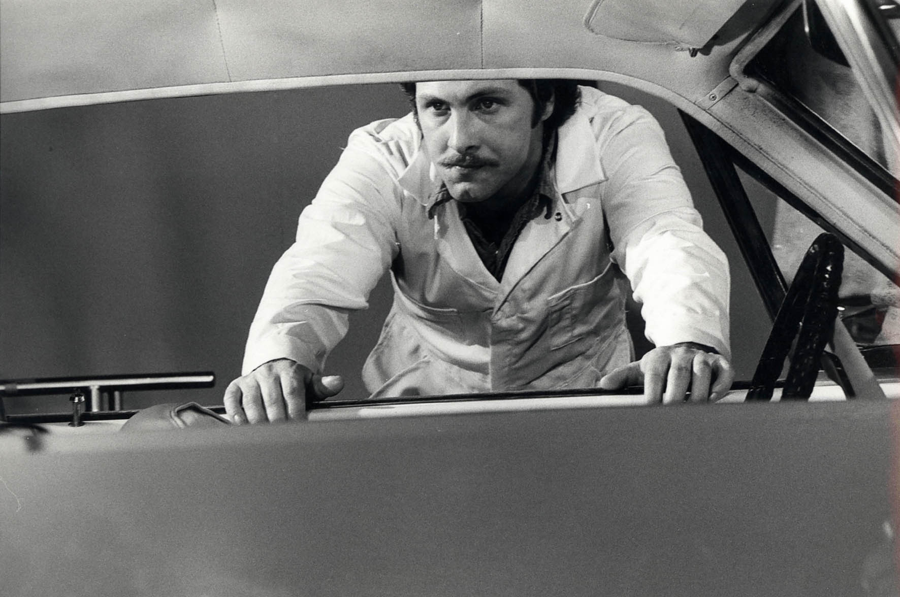 The painter Ed Ruscha is most often associated with paintings that depict words. He is also well-known for his ‘car-seat view of the world’, concentrating on the landscape typical for Los Angeles. In 1963, Ruscha began a series of photographic art books that documented ordinary life in Los Angeles. For Every Building on the Sunset Strip, Ruscha mounted a motorised Nikon to the back of a pick-up truck and photographed every building he passed. Sometime in the summer of 1966, he decided to road-test a typewriter by hurling it out of a speeding Buick. He documented this as if it were a crash-site, where the automotive and the typographic collided, merging as it were the lines of the page with those of the road. Equally important as typography to Ruscha was the impact of film. Many of his painted works reflect the way credits appear. His oeuvre includes a group of works that deal with the final words on a film: ‘The End’. In a series from the 1970s and 1980s the panoramic cinemascope format compounds the literal and the lateral in a sweep, landscaping the text into the form of a title credit. In the context of Hollywood, making a film about a car mechanic is not all that strange an intermezzo in the career of this ‘conceptual pop artist’. Ruscha has stated that film has had a strong impact on his artistic decisions; he actually directed two short films (Premium dates from 1971).