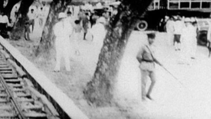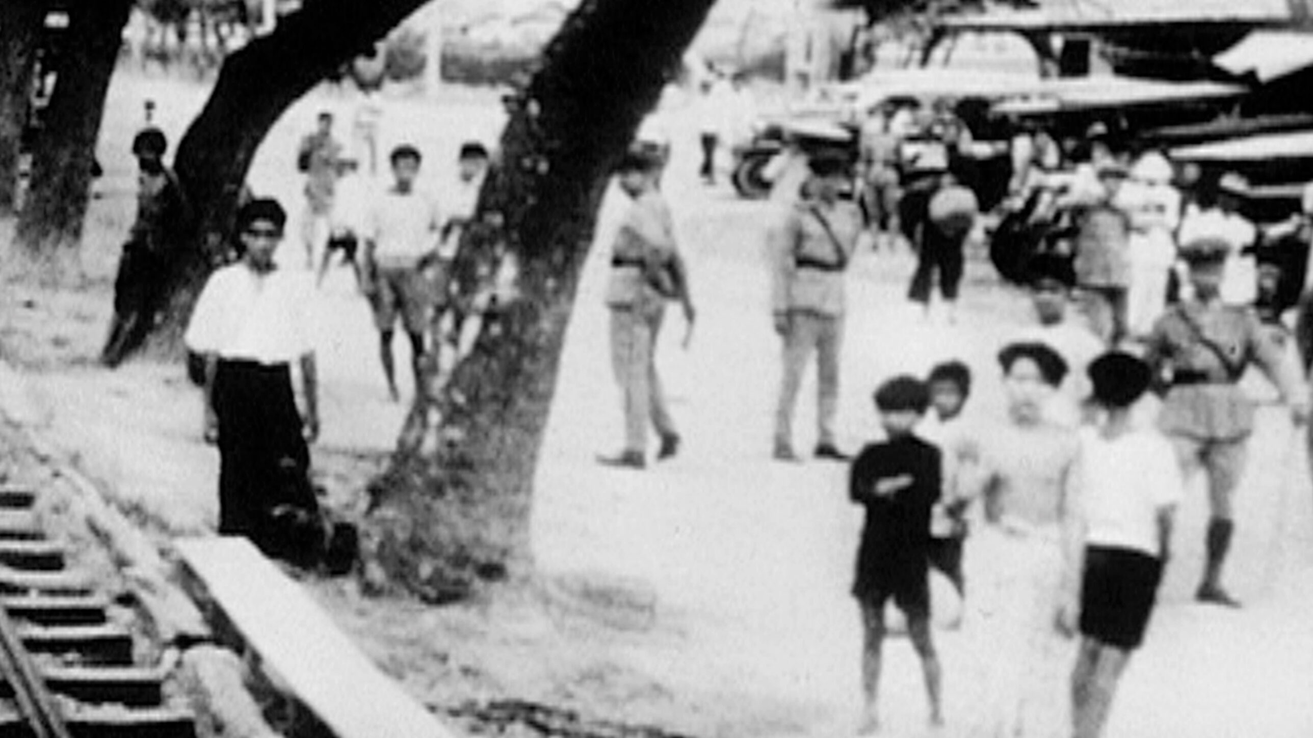 The master of the stroboscopic depth illusion changes territory, but applies his familiar strategy: a ghostly, flicking film takes us into a deep and ominous Asian past. Jacobs: ‘Bangkok, is it? Spelled in an unfamiliar way.’ A black-and-white train ride along a jungle stream shows us military men in their pith helmets, keeping the ferns, trees, monkeys and natives in line. Sparse intertitles trigger further thoughts about the war economy.
