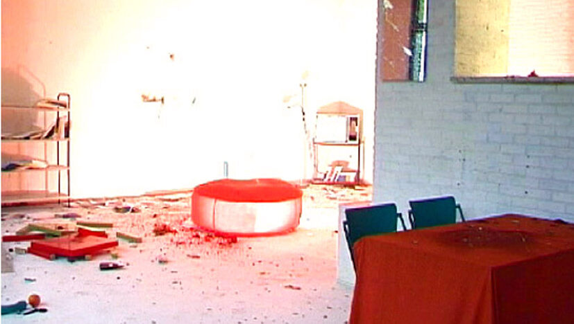 The action takes place in a space like a living room in which various elements are shaken awake. -
