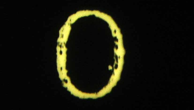 A 16mm performance with six projectors, in which letters that are printed straight onto the film are present in both sound and image.