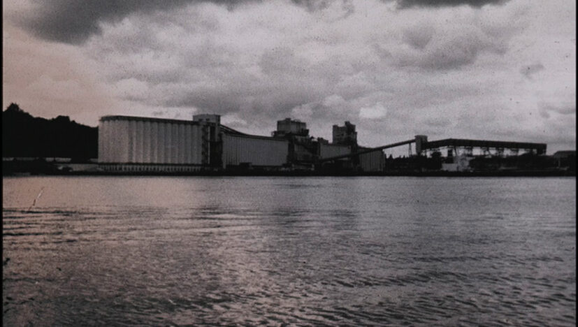 Prize-winning film with sanded, flickering images in sepia tones of decaying buildings on the quayside. -