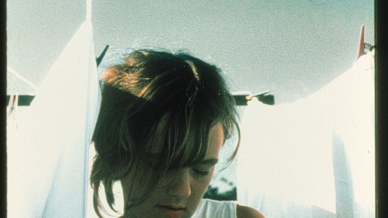 Een vrouw stapt uit de douche, kleedt zich aan en gaat de was ophangen. Haar man maait verderop het gras.