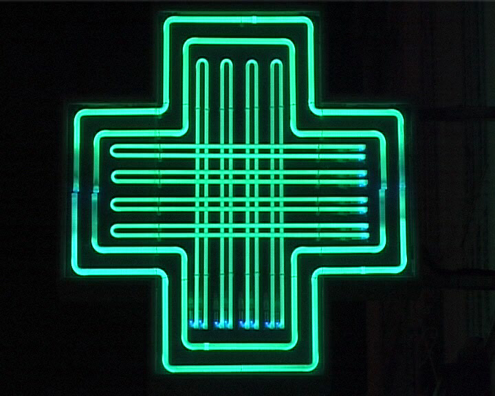 De glimmende neonlichten van de apotheken in Cannes een eerste hulpteken voor zieke mensen wordt een belangrijke concurrent van de andere lichtreclames in de Franse filmstad.
