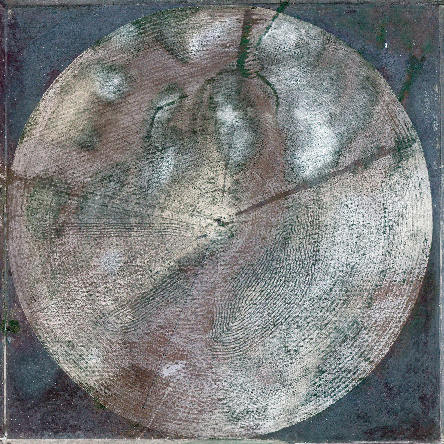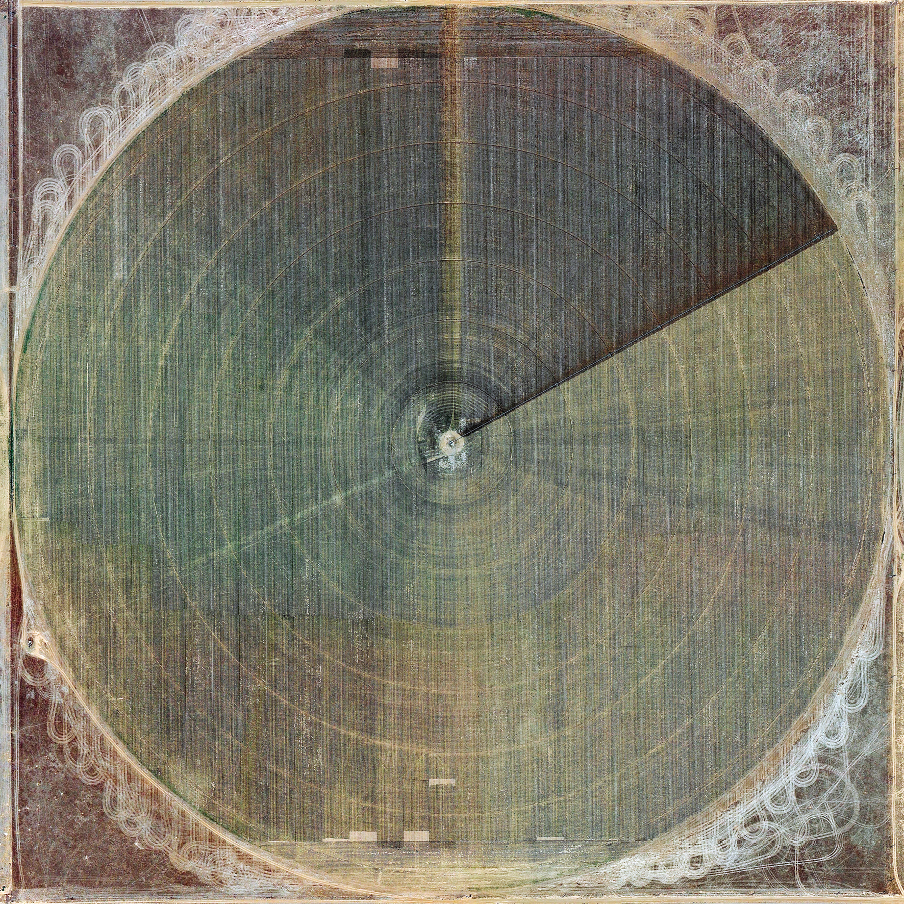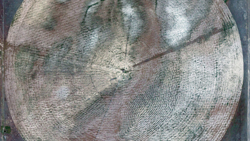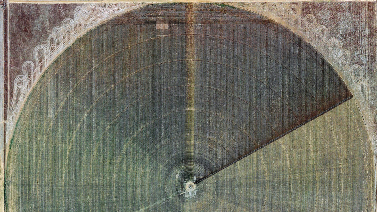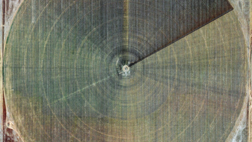 Gerco de Ruijter sneed duizend cirkels uit Google Earth en maakte deze experimentele videocollage over irrigatie in de Verenigde Staten. Sproeiers draaien rond in een centrale as en irrigeren ronde velden van groene gewassen en woestijngebieden. Voorbode van een groter project.