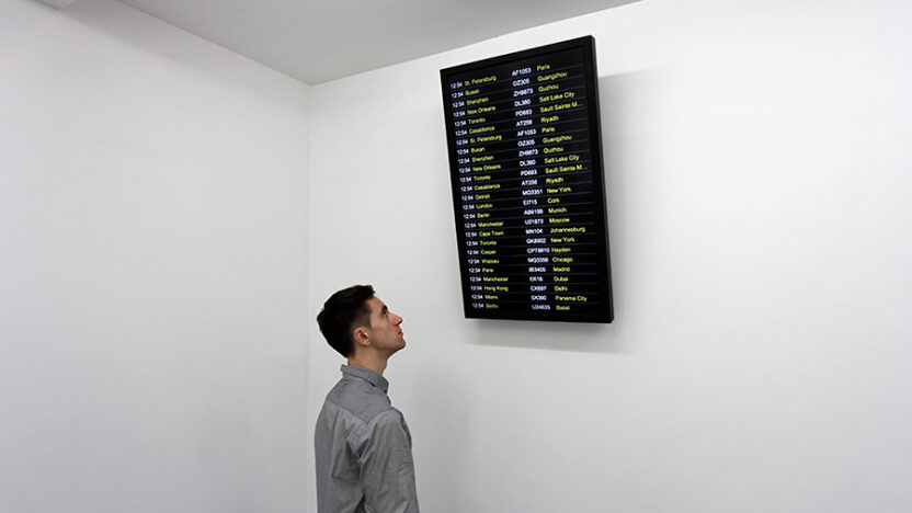Elke paar seconden zetten honderden mensen hun elektronica uit voor het opstijgen. Deze routinehandeling impliceert het gecoördineerde werk van honderden mensen in een complex systeem. Zie ook Text Trends. do 22 t/m wo 28-1, doorlopend, lobby Hilton Hotel, gratis toegang