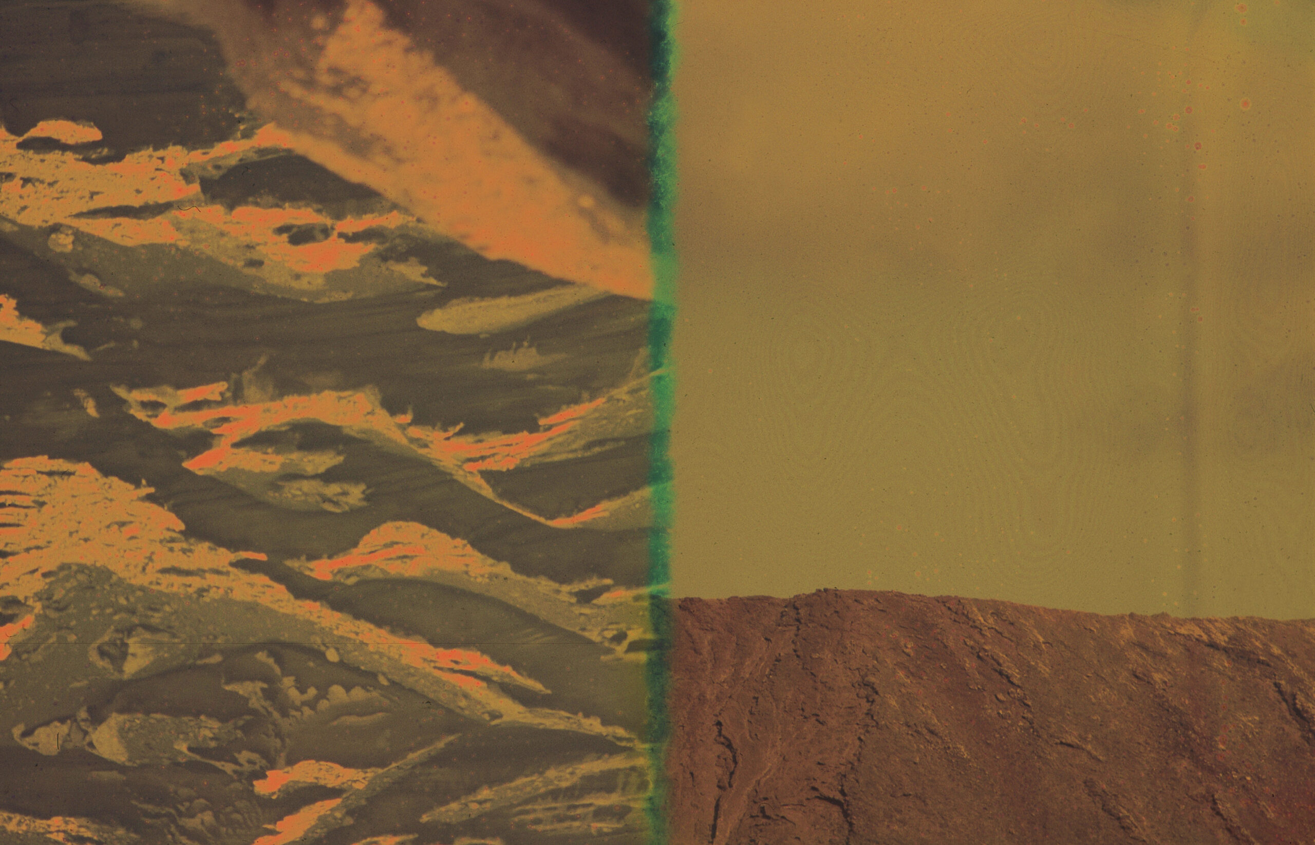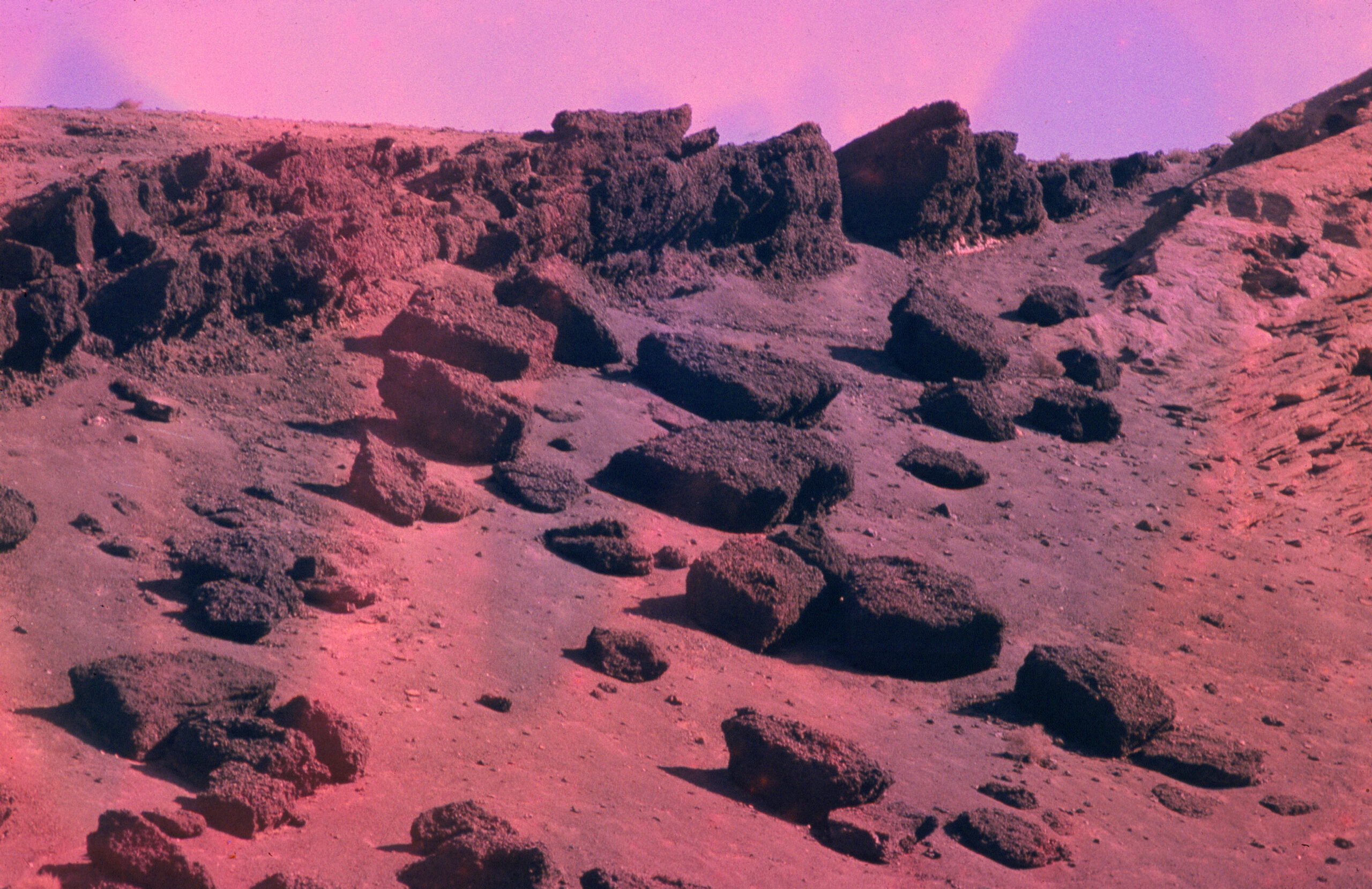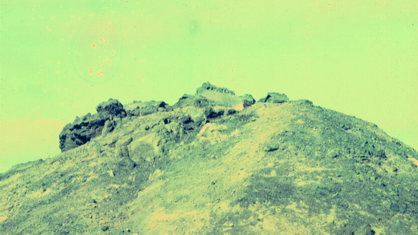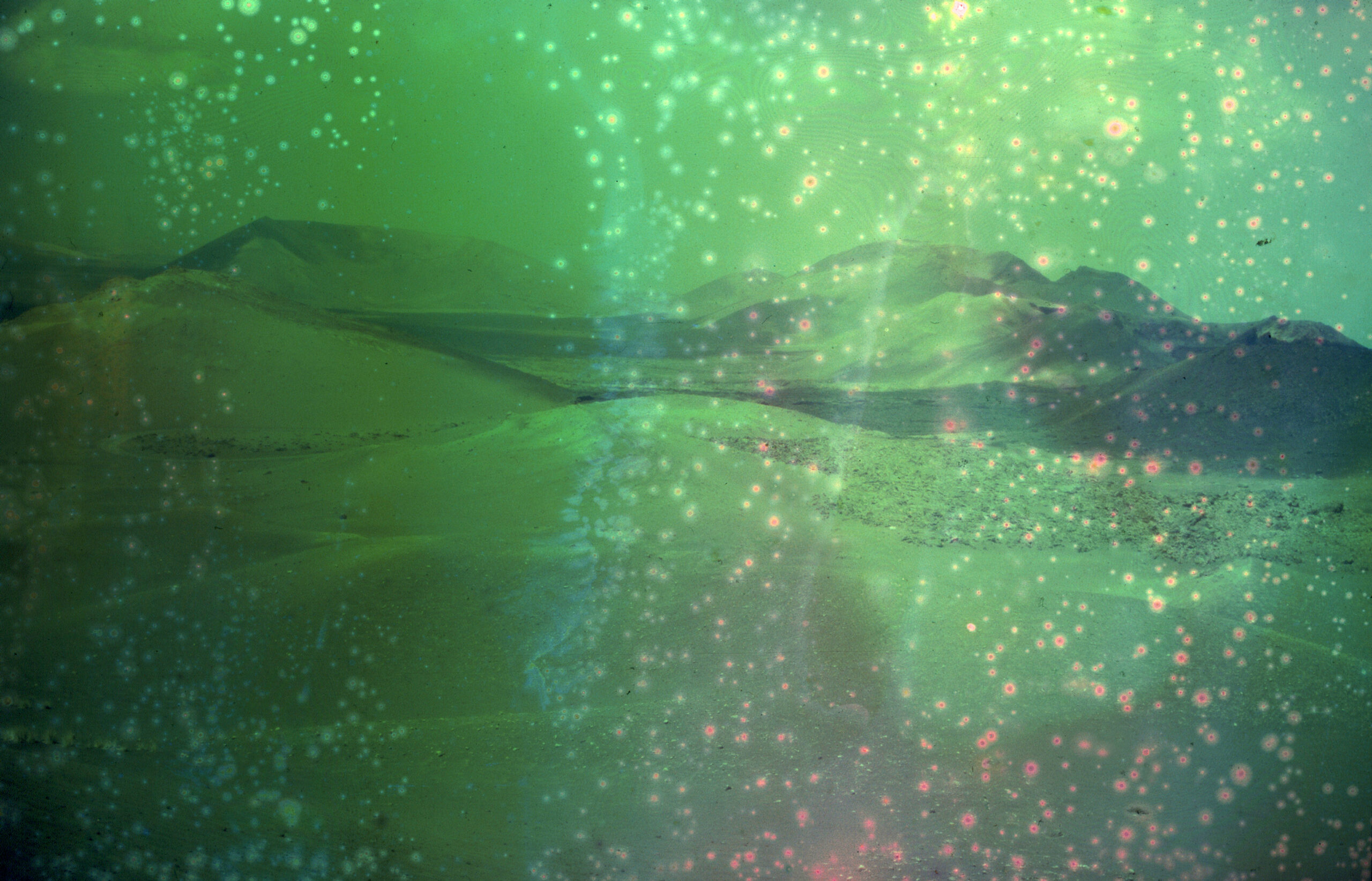 Deze dia’s van het vulkaanlandschap van Lanzarote lijken een toekomst te tonen die doet denken aan het ontstaan van de aarde. Door de negatieven bloot te stellen aan alledaagse chemische stoffen vervagen de details en doemen er kleuren op die het eind van de geschiedenis voorspellen.