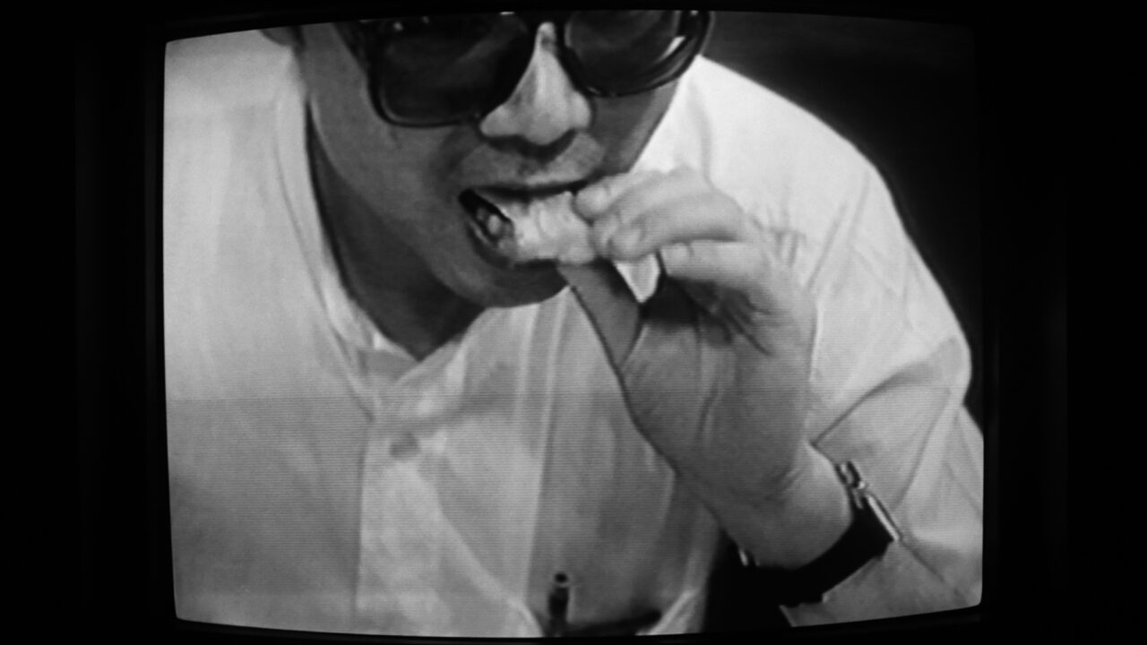 In een reeks performances waarin Imai Norio polaroids gebruikt, zien we hem hier punten van een pizza eten terwijl hij deze in beelden doet herleven. Onder het eten vat Imai op speelse wijze de unieke eigenschappen van polaroidfotografie samen in een tafelbladperformance.