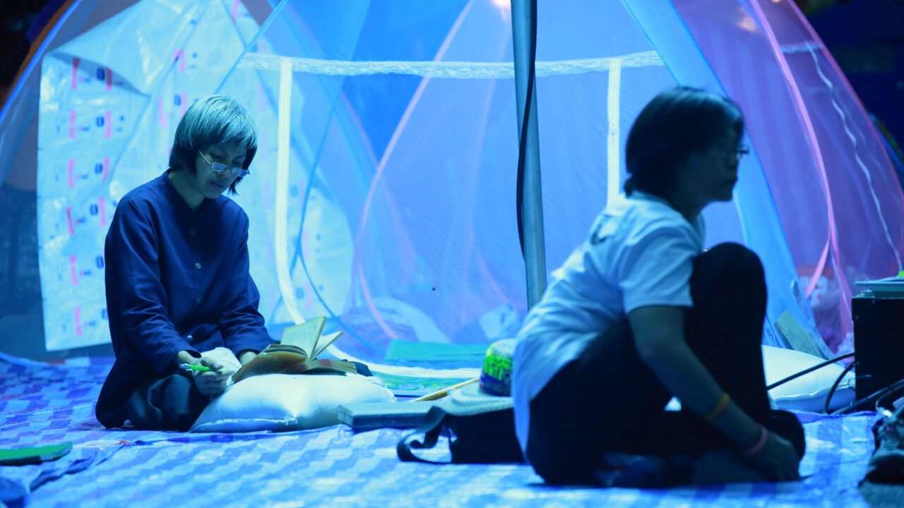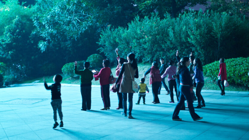 Een led-scherm laat de samengekomen massa baden in zulk sterk kunstlicht dat ze zich in een bovennatuurlijke ruimte lijken te bevinden. In deze subtiele fascinerende video, gedraaid in Guangzhou en Bangkok in een periode vol demonstraties, beschouwt Zhou Tao de huidige rol van openbare pleinen.