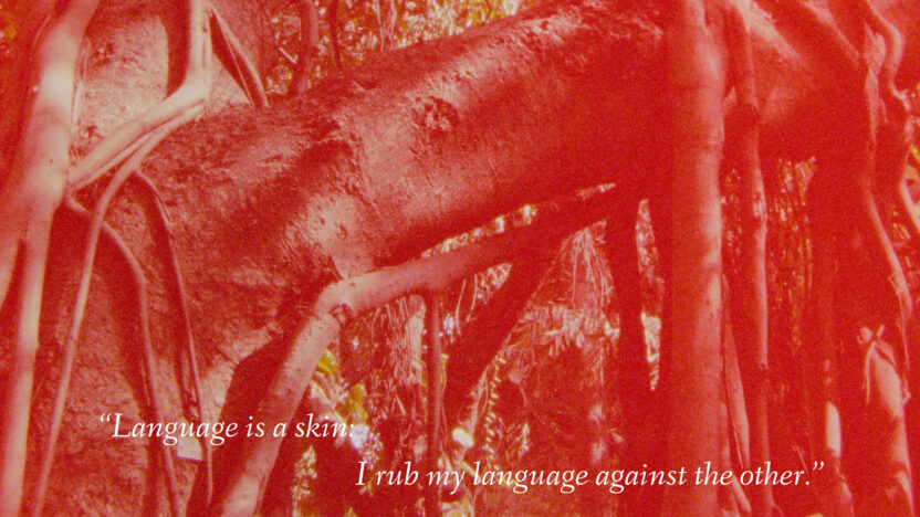 Deze associatieve collage traceert generationele echo’s van migratie in foto’s, taal, kaarten en lichamelijkheid.