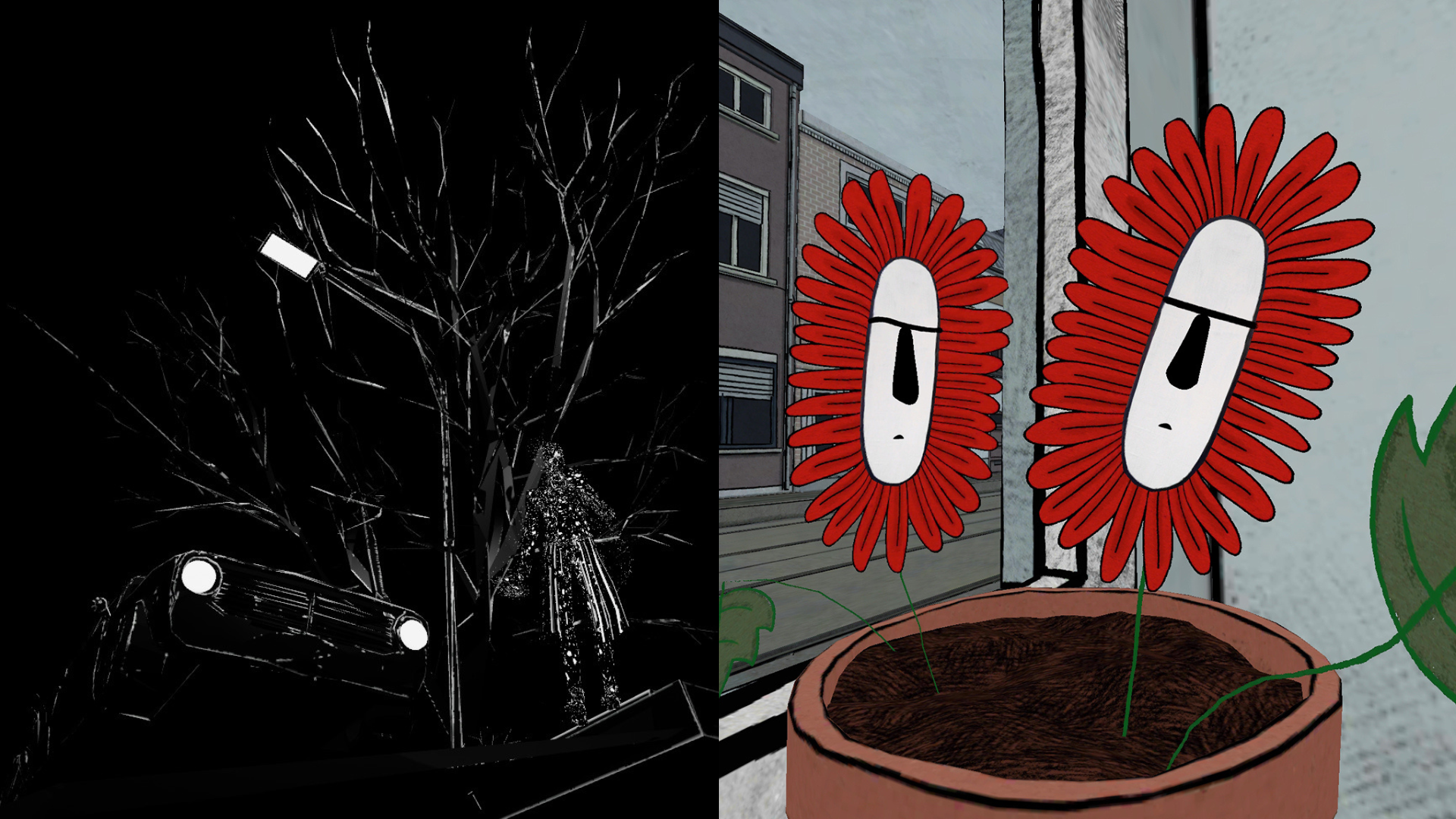 Drie verveelde geraniums snakken naar de wijde wereld, voorbij de vensterbank van hun eenzame eigenaar. -