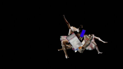 De ongewone beweging van een danser wordt ‘gescrubd’: getransformeerd door een stotterende manipulatie van beeld en geluid. -
