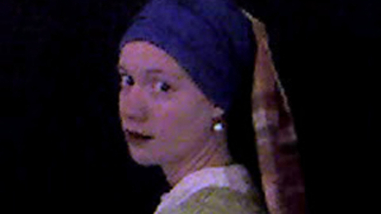 Een meisje transformeert zichzelf met behulp van de camera op haar telefoon in het meisje op Vermeers Meisje met de parel. Pixels worden digitale pens -