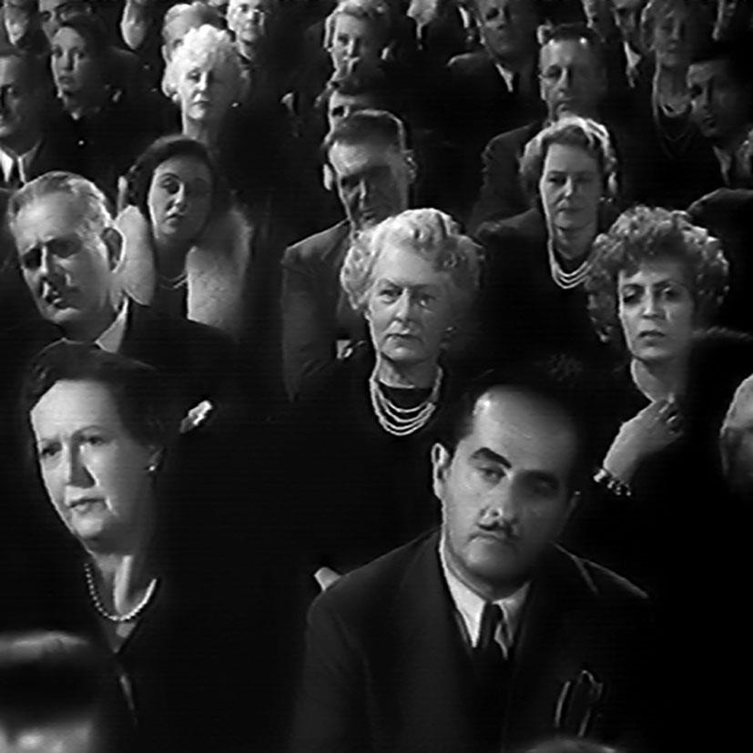 Play is een montage van archiefbeelden van publiek in de zaal. Wat er op het scherm gebeurt, kan alleen gezien worden als reflectie in de… -