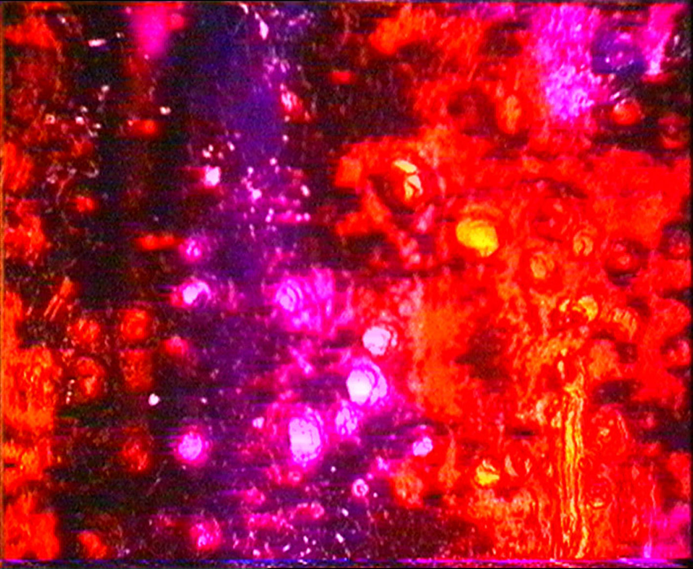 Super8 filmbeelden van neonlichten werden gebruikt als ruw materiaal voor een abstracte film, die werd behandeld met bleekmiddel en inktsoorten om ingewikkelde patronen en texturen… -