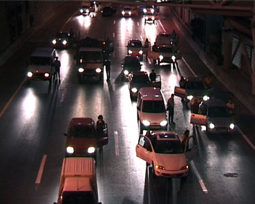 Vervreemdende opnamen van een nachtelijke snelweg. -