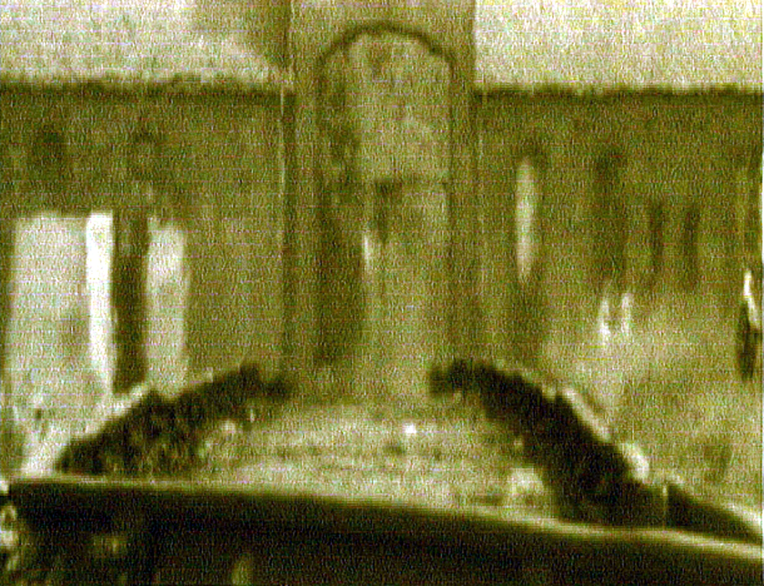 ‘De Poort des Doods van Auschwitz’, getoond in vervormende gedaanten, met in de uitkijkpost de silhouetten van de schimmen des doods. -