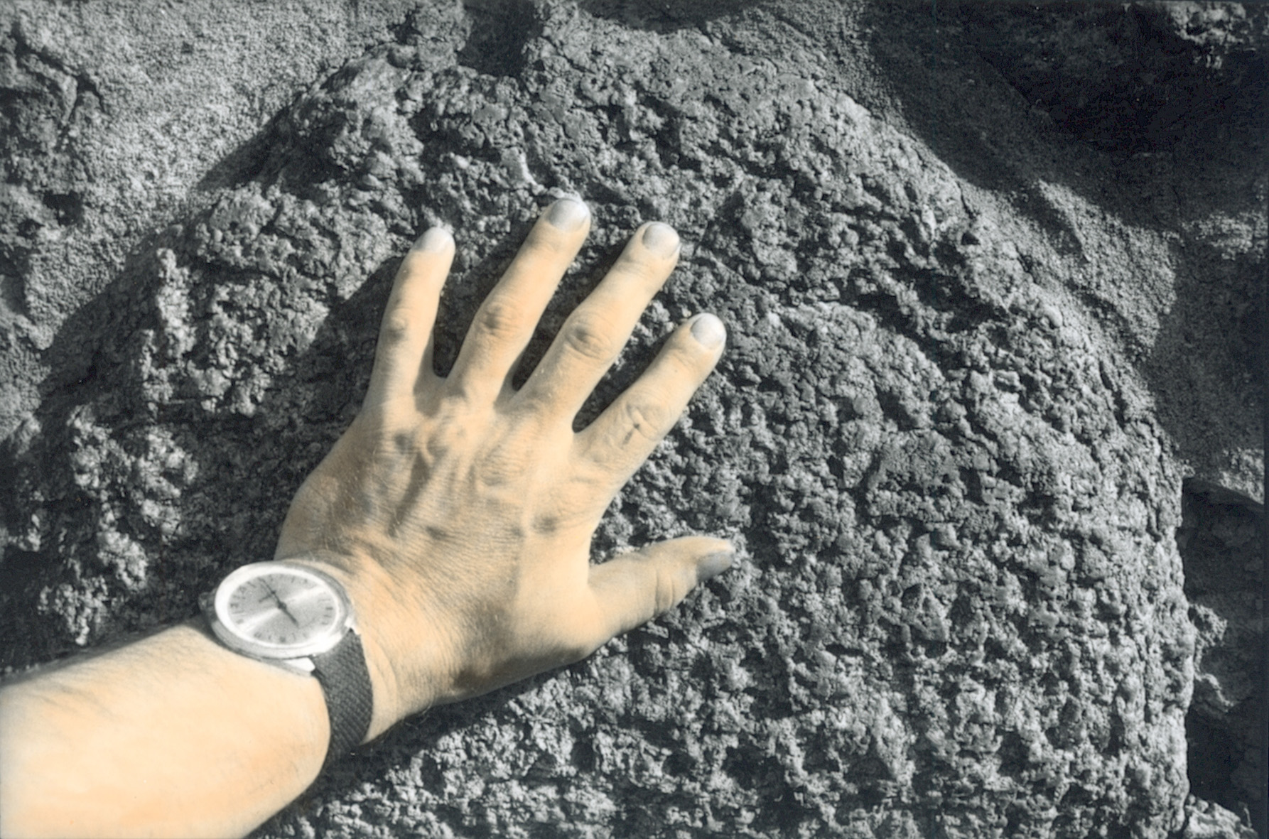Een jubelende buiteling van archiefmateriaal rond een man in onbekend buitenaards gebied. -