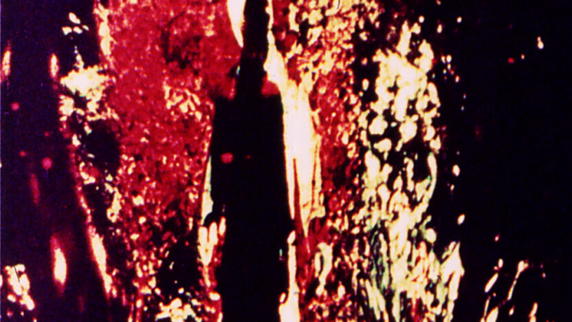 Een stukje film van een figuur op een bospad vormt het startpunt voor een uitbundige evocatie in beweging en geluid, in gelaagde 16mm-dubbelprojectie. -